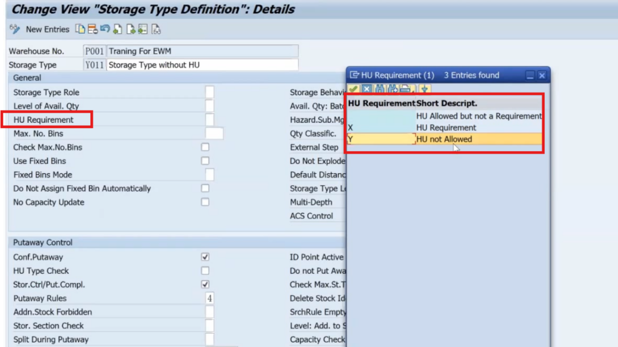 HU requirement:为空,则HU和非HU的库存都可以放在这里;为X则只有HU的库存才能存放在这里;为Y则HU库存不允许存储在这里。