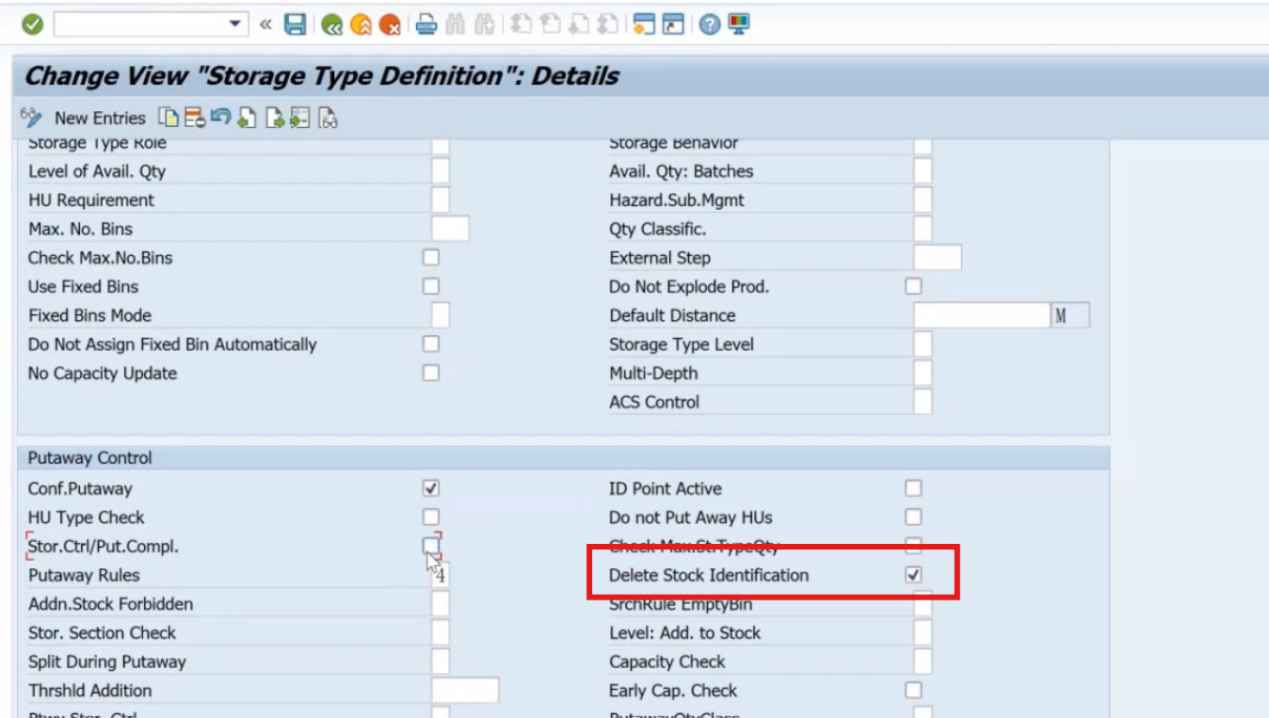 字段Delete stock identification:系统根据这个标记决定要不要将存放在这个storage type里的库存的相关信息清理掉。