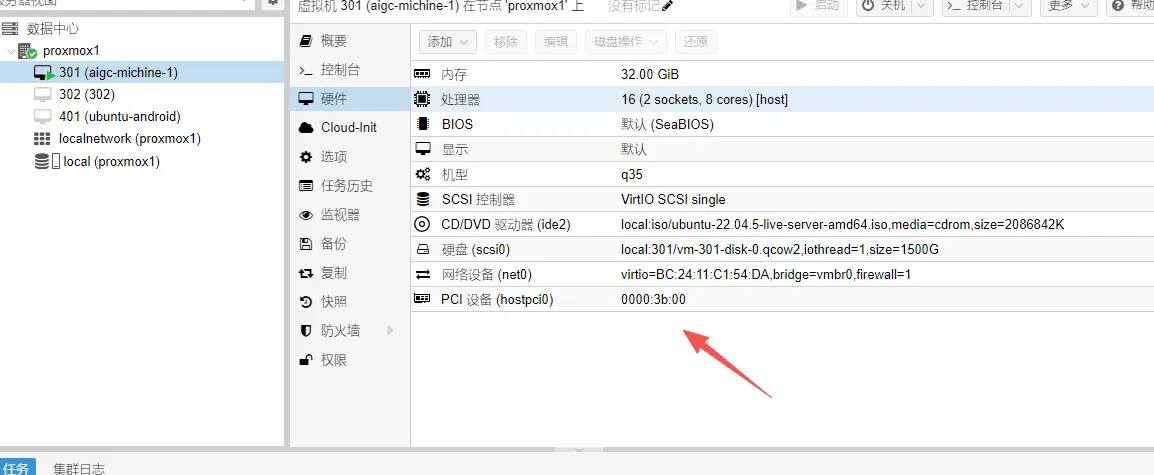 难道proxmox系统升级,pci直通失效了?登录web控制台发现vm实例pci设备在: