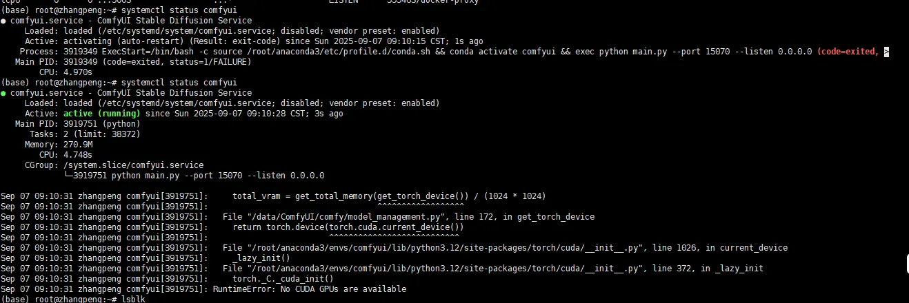 继续执行 systemctl status comfyui 发现:No CUDA GPUs are available