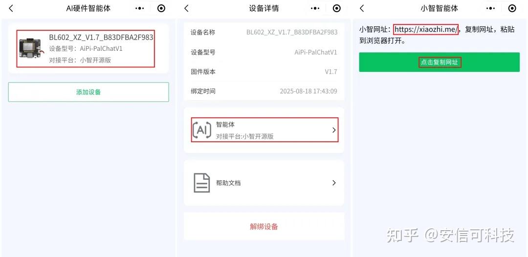点击设备,进入设备详情,点击 智能体,复制小智网址https://xiaozhi.me/