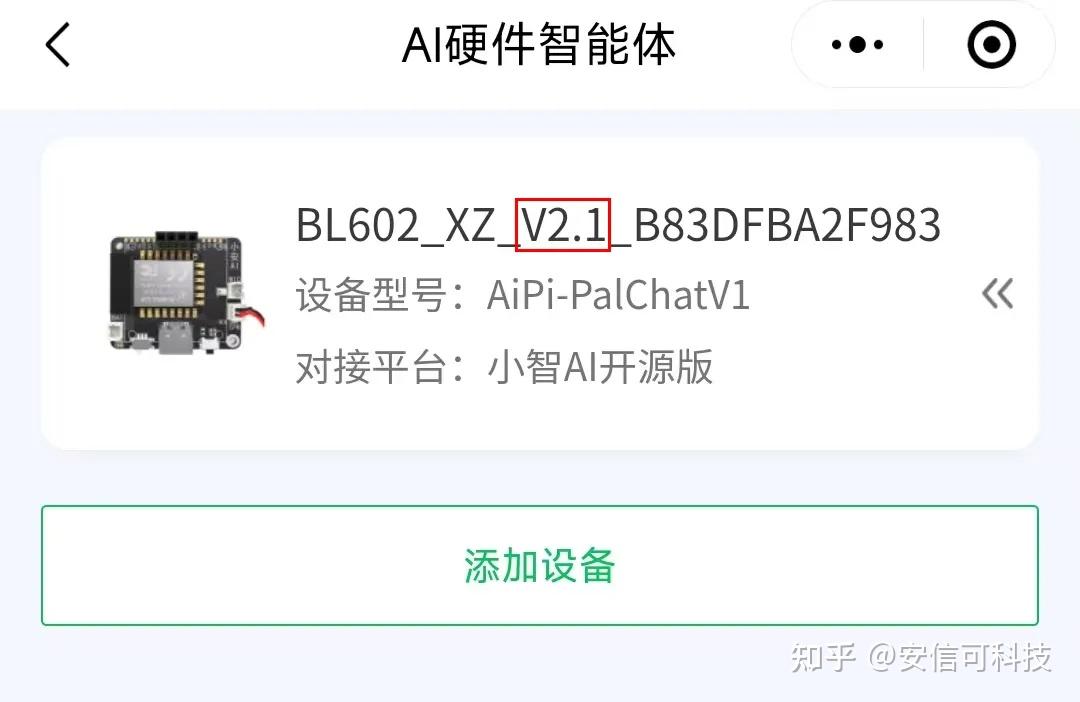 微信搜索安信可 IOT小程序,打开小程序,选择 AI硬件智能体,点击 添加设备,点击 扫描设备,找到“BL602_XZ_XXXXXXXXXX”,并连接,填写WIFI SSID和密码,点击 配置WIFI,等待连接,成功后就能看到设备了,设备会循环播报6位数字验证码,后面会用到这个验证码