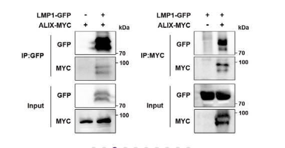蛋白A/G磁珠(4 h)。通过co-IP试验检测LMP 1-GFP和阿利克斯-MYC之间的相互作用。
