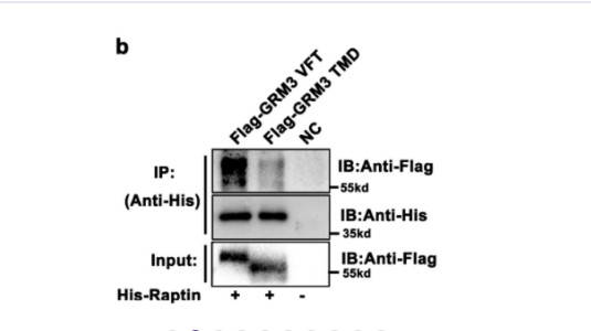 Raptin与下丘脑GT 1 -7神经元中GRM 3 VFT或GRM 3跨膜结构域(TMD)之间结合的免疫沉淀(IP)分析。将具有人GRM 3-VFT或人GRM 3-TMD过表达的下丘脑GT 1 -7神经元的细胞裂解物与PBS或His-Raptin孵育。