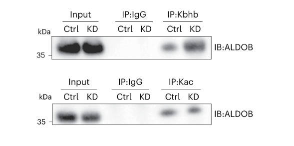 蛋白A/G磁珠(50 μL; 2 h)。免疫印迹显示来自喂食对照饮食或KD 5周的雄性小鼠的肝脏中ALDOB的Kbhb或Kac。用来自小鼠肝全细胞裂解物的泛Kbhb或泛Kac抗体进行免疫沉淀。