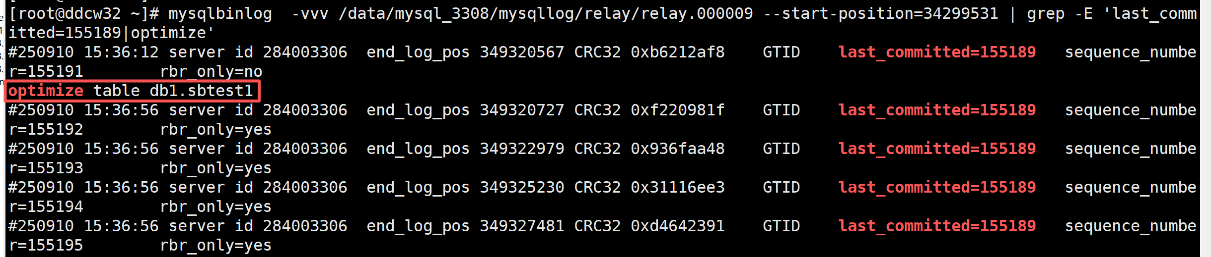 我们可以看到拥有相同的last_committed=155189的事务中就包含了我们的optimize命令. 而这些事务(含optimize命令)是可以并行回放的, 也就可能出现上面的死锁的. 而出现此现象的条件就是: 主库大量DML,并且期间有该表的optimizze操作.
