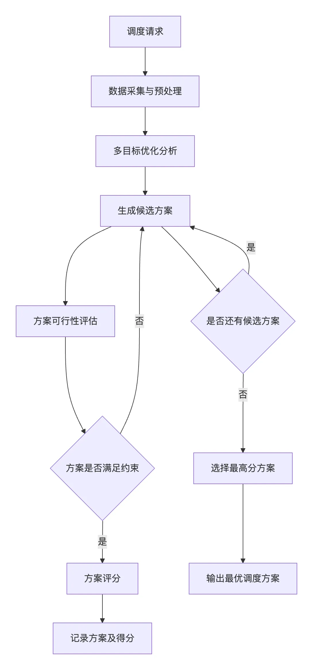 schedules: 调度方案数组。resources: 资源信息数组。onSelectSchedule: 方案选择回调函数。方案生成流程图:展示了智能调拨系统生成优化方案的决策流程