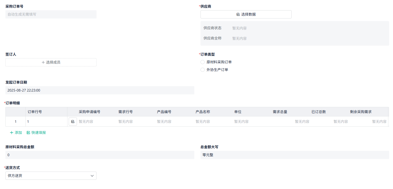 - 流程配置提交后触发审批流程(申请人→部门主管→采购专员)。审批通过后自动生成采购订单,并关联供应商信息。