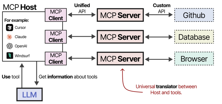 MCP标准化了对各种服务的API访问,包含三个组件:MCP主机(LLM应用程序)、MCP客户端(维护连接)和MCP服务器(提供上下文和能力)。