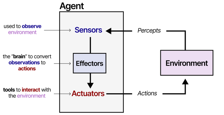 智能体的标准定义来自Russell & Norvig的《人工智能:一种现代方法》:能够通过传感器感知环境并通过执行器对环境采取行动的任何事物。智能体系统包含环境、传感器、执行器和效应器四个关键组件。