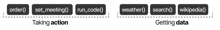 工具使LLM能够与外部环境和应用程序交互,包括数据获取和行动执行两类。工具调用通常通过JSON格式实现,也称为函数调用(Function Calling)。