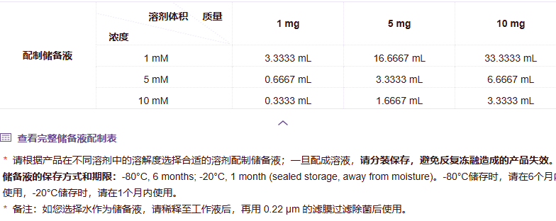 溶解度:H₂O ≥ 100 mg/mL(≈333 mM),DMSO ≥ 100 mg/mL(建议使用新开封DMSO,避免吸湿影响溶解)
