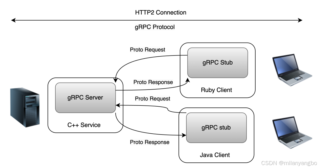 <Length-Prefixed Message>gRPC基于这样的一个设计理念:定义一个服务,及其被远程调用的方法(方法名称、入参、出参)。开发者可以像调用本地方法一样,使用gRPC客户端存根(stub)调用远程机器上 gRPC 服务的方法。gRPC 的客户端和服务端都可以用任何支持 gRPC 的语言来实现,例如一个 gRPC 服务端可以是 C++语言编写的,以供 Ruby 语言的 gRPC 客户端和 JAVA 语言的 gRPC 客户端调用,如下图所示。