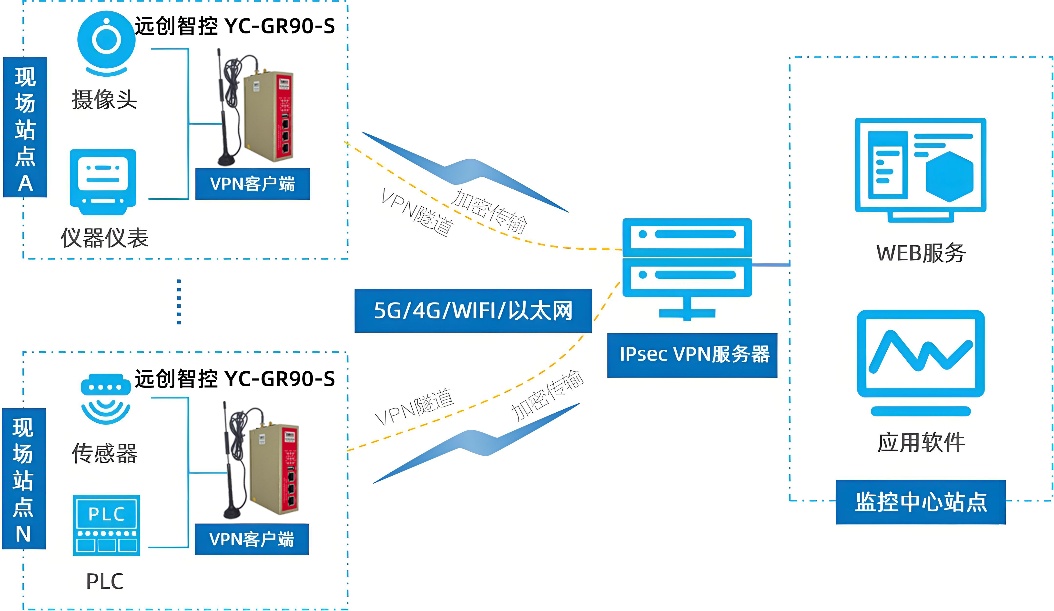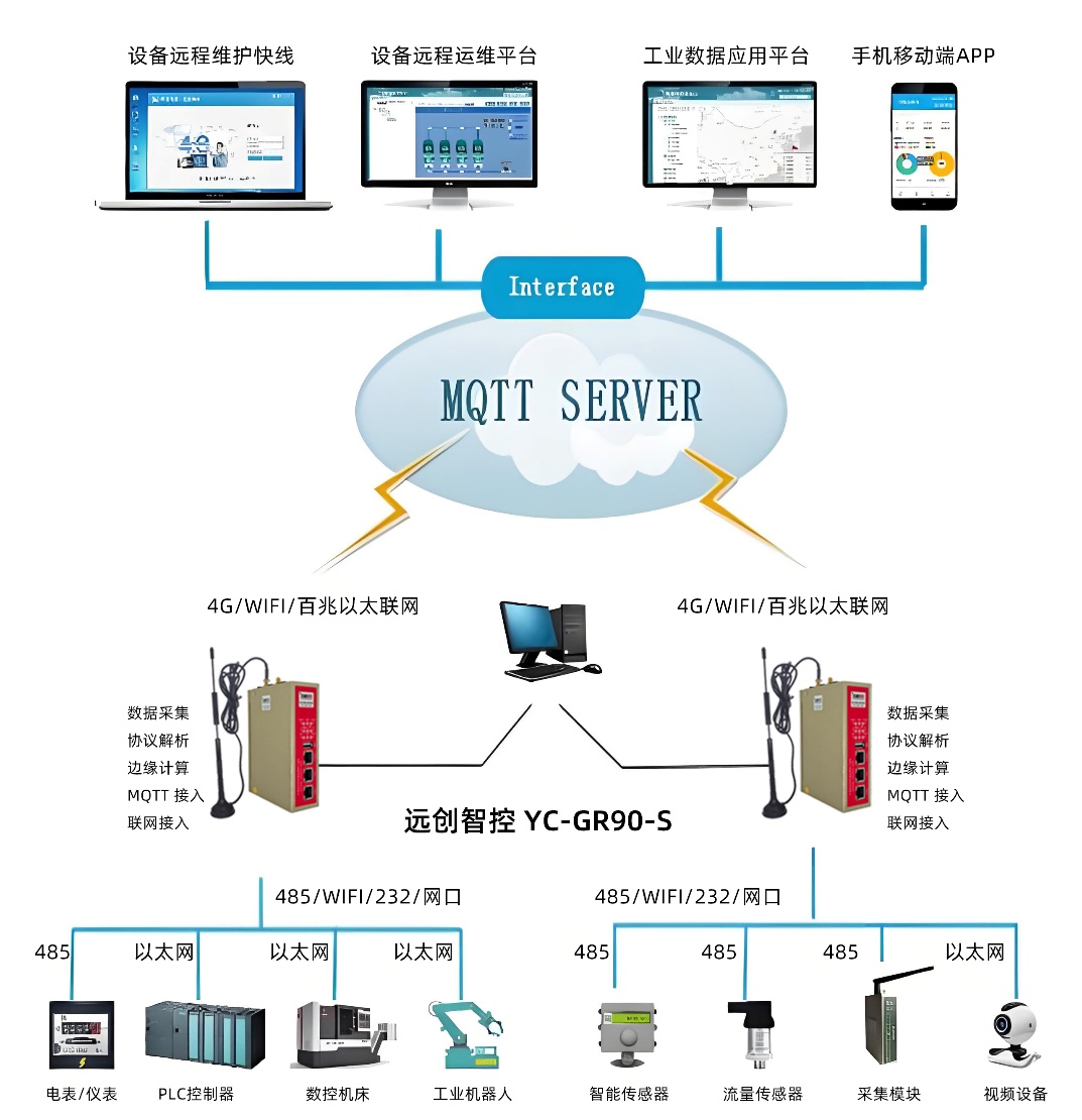 2. 通信层:由远创智控 YC-GR90-S 工业智能网关组成,负责协议解析、数据采集、边缘计算与MQTT上传;