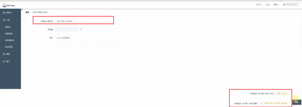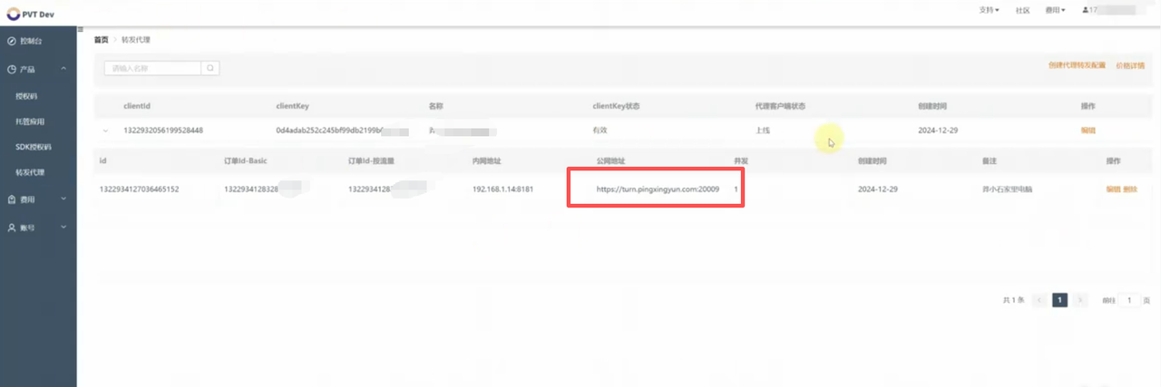访问开发者平台创建转发代理服务。 首先,您需要添加一个转发代理的Key,这需要您设定一个Key名称,通常以项目名称作为标识。 完成设置后,系统将生成内网穿透所需的clientId和clientKey信息。