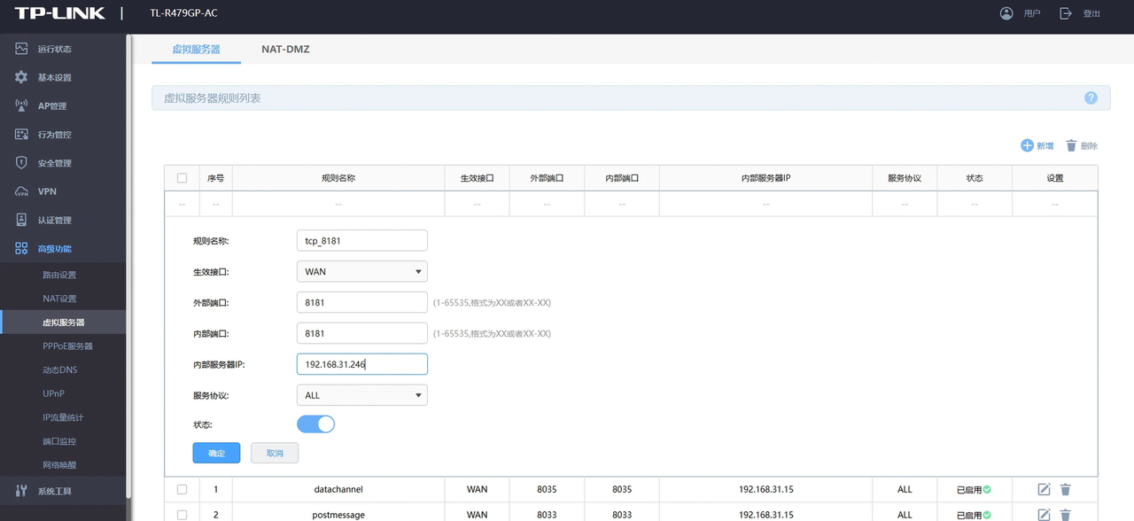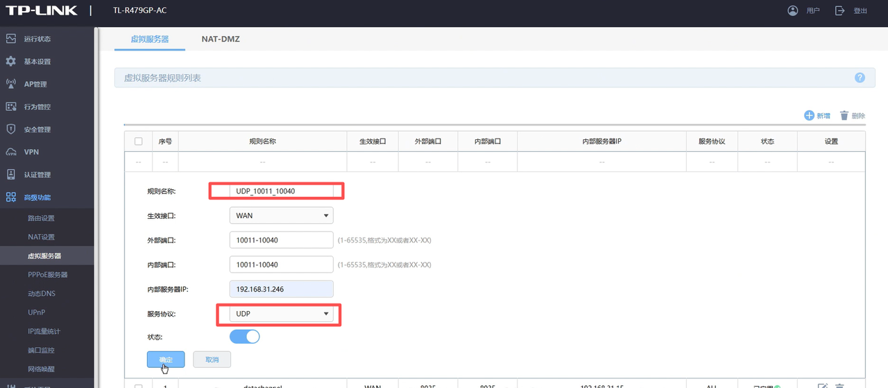 在路由器管理界面进入“虚拟服务器”配置(或者防火墙/端口转发/NAT 端口映射之类的名字),新增端口并放行: