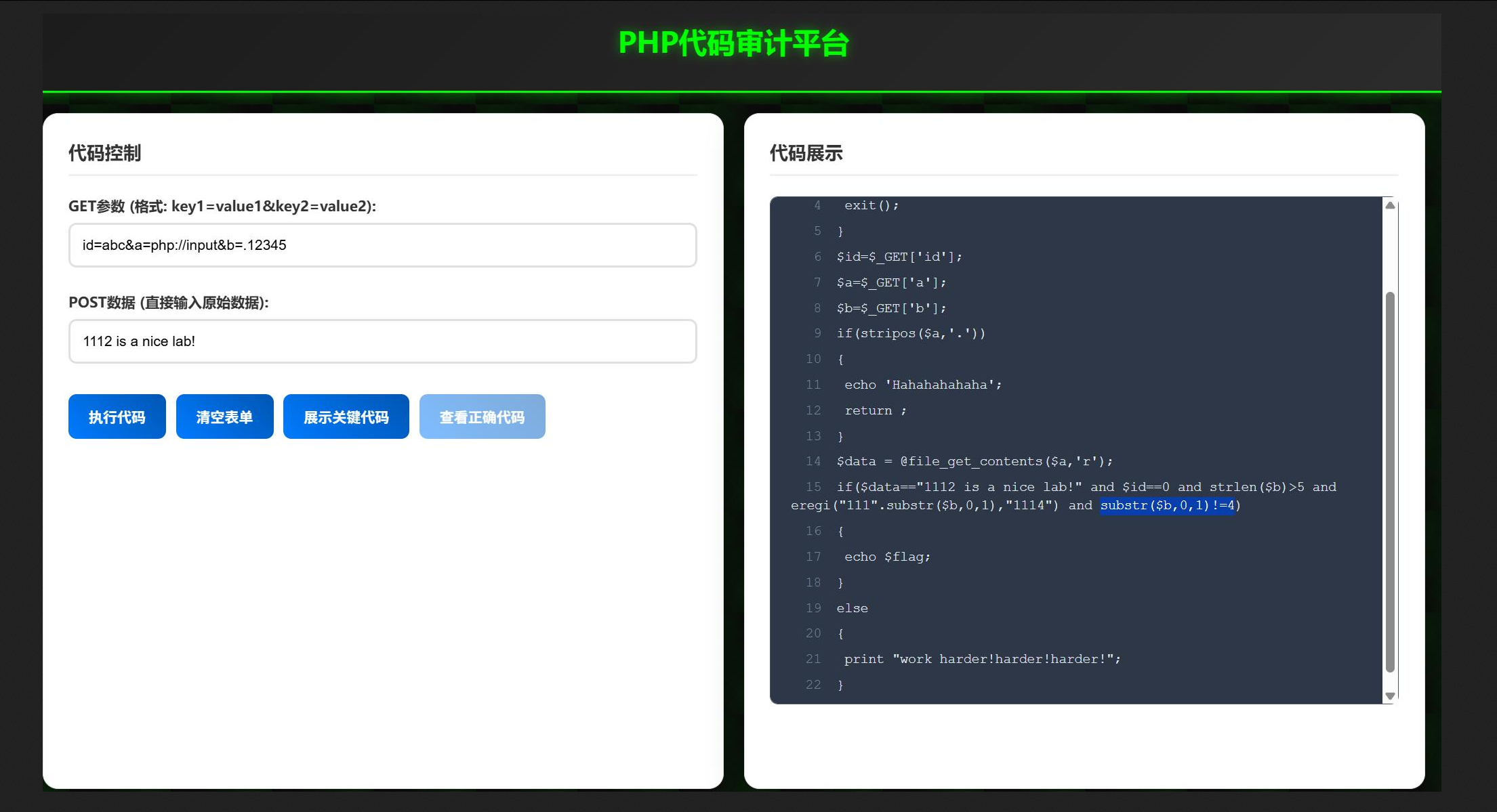 substr($b,0,1)!=4所以可以让$b[0] == '.',那么正则是 '/111./i',可以匹配 "1114"。所以只要 $b 的第一个字符是.,就能满足这个条件 并且 strlen($b) > 5,所以 $b 可以是:.xxxxx(总长度 >5)
