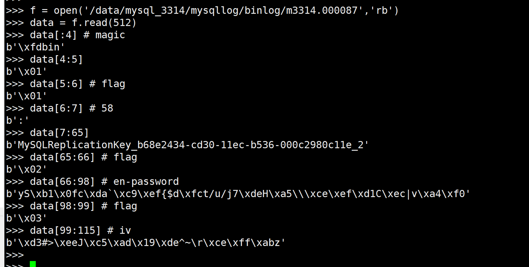 实际上当时解析keyring file就是参考的人家解析keyring binlog的脚本... 地址:https://mysql.wisborg.dk/2019/01/28/automatic-decryption-of-mysql-binary-logs-using-python/