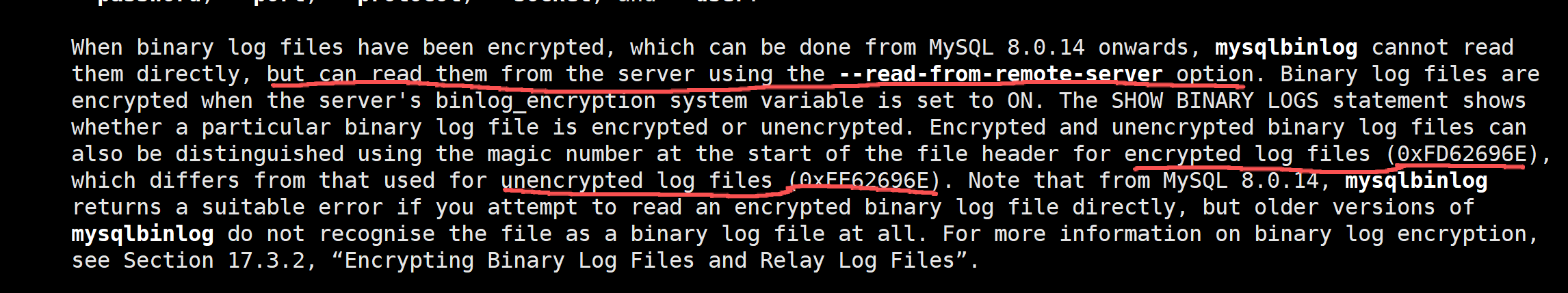 可能会有极少数的环境会对binlog进行加密, mysql在8.0.14的时候, mysql支持对binlog/relay-log进行加密, 只需要设置参数binlog_encryption