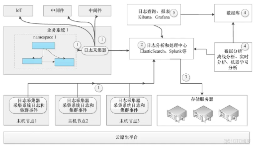 标注①的几个位置显示的是日志采集器运行在Kubernetes集群的每个节点内,负责采集系统日志以及集群事件信息。此外日志采集器还负责采集应用层的日志以及中间件等外部资源的日志。日志采集器的实现技术有filebeat、logstash等。