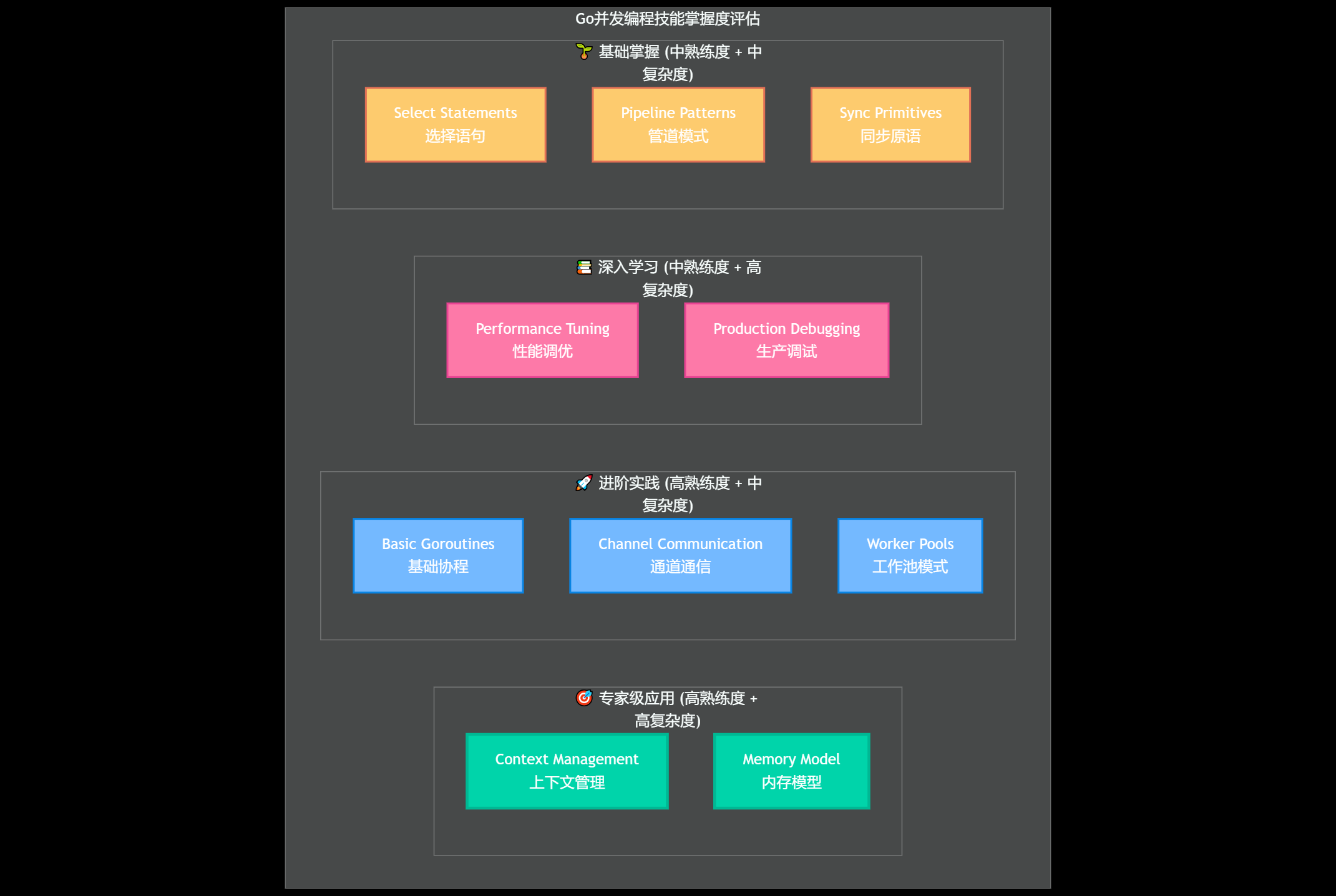 图4:Go并发编程技能掌握程度象限图 - 各技能点的复杂度与熟练度评估