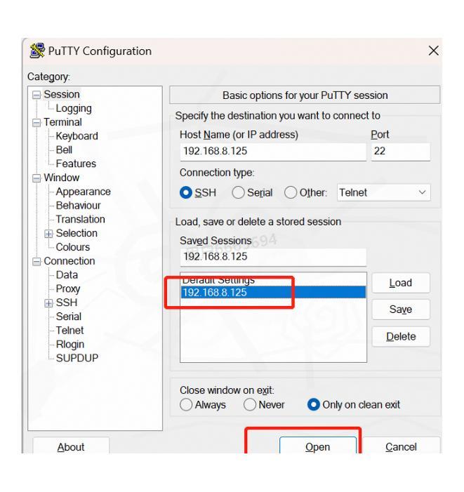 ③ 建立连接:选中之前保存好的配置,点击"open"按钮开始连接。