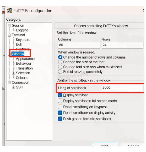 PuTTY默认只保存200行历史记录,这对于查看长输出结果很不方便。建议修改为更大的值:鼠标右键点击窗口顶部,选择"Change Settings",导航到"Window"选项,将右侧的"Lines of scrollback"值增加,例如改为20000行。