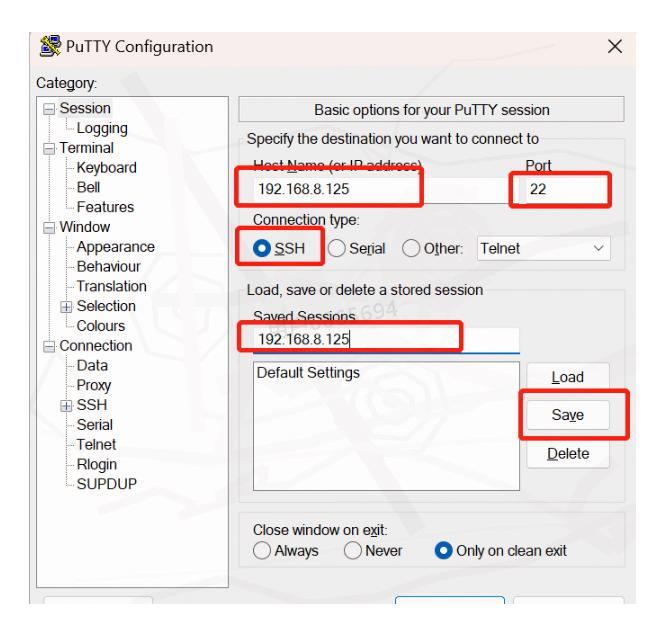 ② 配置连接信息:在主界面输入您需要连接的服务器IP地址和端口号(SSH默认端口为22)。别忘了给这个连接起个名字,然后点击"save"按钮保存配置。