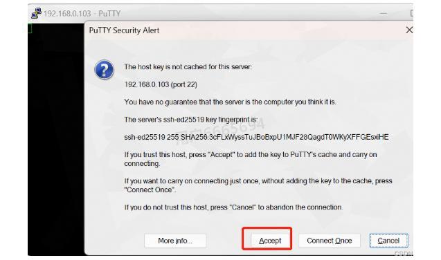 ④ 接受安全提示:首次连接时,会弹出安全警告窗口,点击"accept"继续。