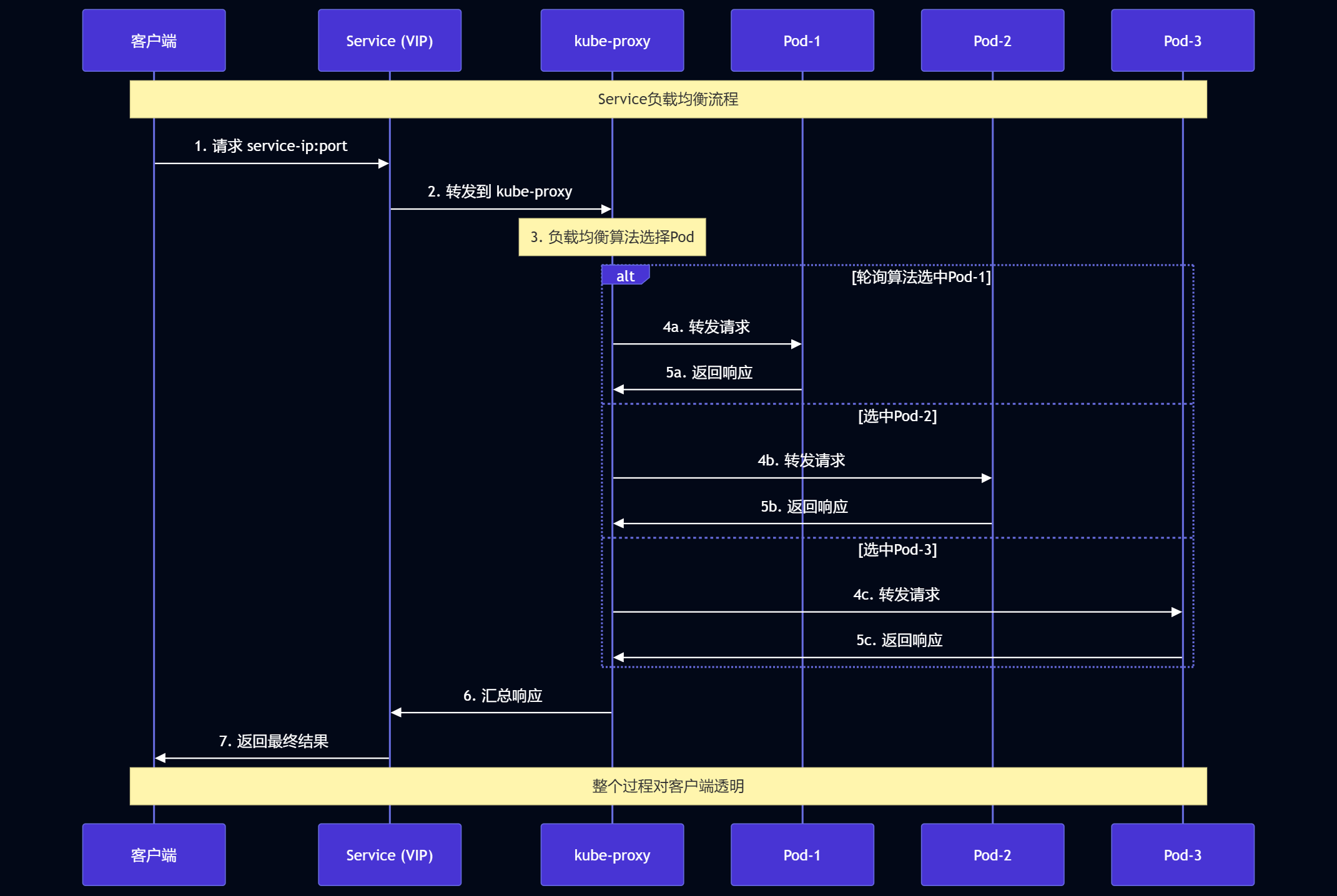 图2:Service负载均衡时序图(Sequence)- 展示请求从客户端到Pod的完整流程