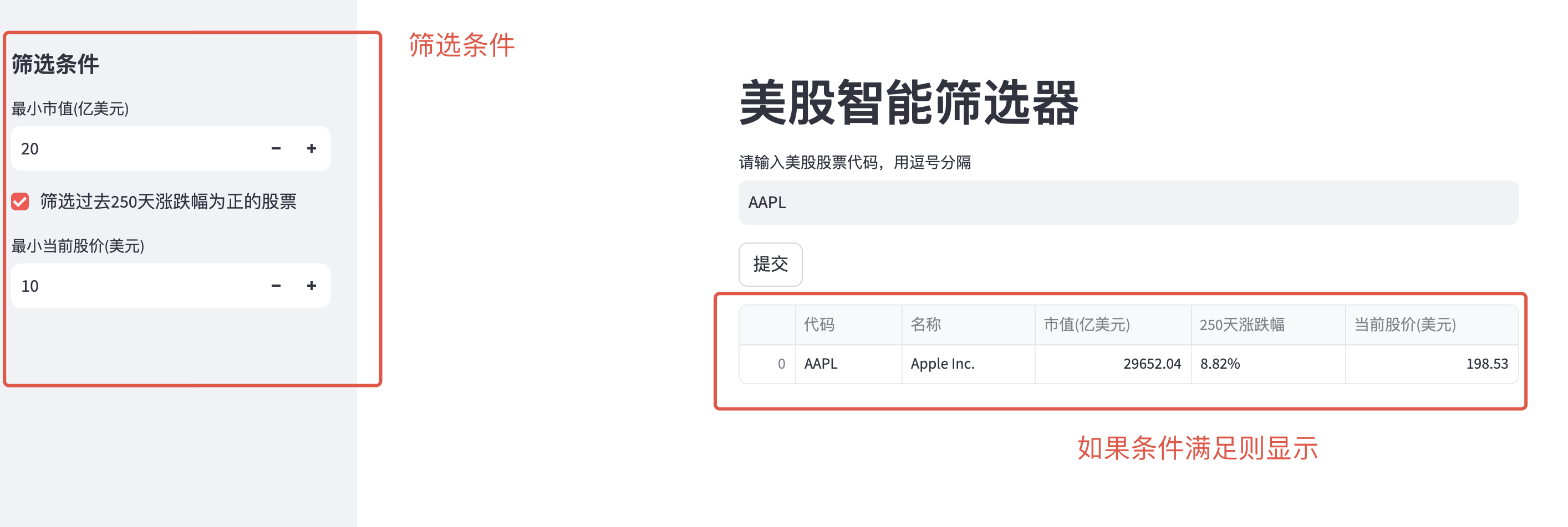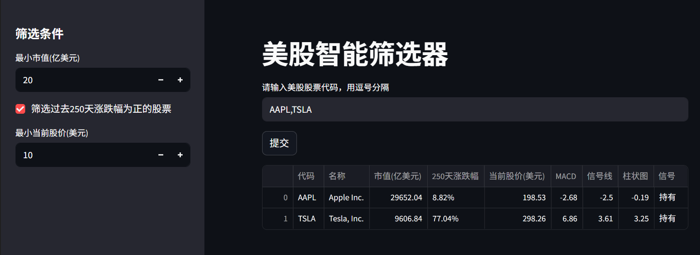 短时间内可完成一个美股智能筛选器:输入股票清单 → 自动拉取数据 → 判断是否满足条件 → 实时表格展示结果。
