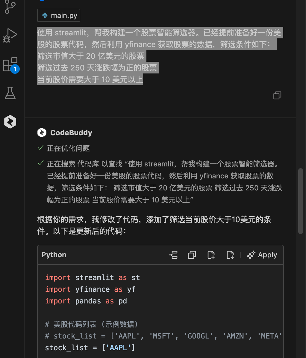 请输出可运行的 app.py,并给出本地运行步骤。几秒钟即可得到初版代码 → 点击 Apply/采纳 → 自动对现有工程做最小变更。若遇到报错(如 429 Too Many Requests),把错误信息直接发给 CodeBuddy,让它给出重试/节流/缓存等修复方案并自动改码。