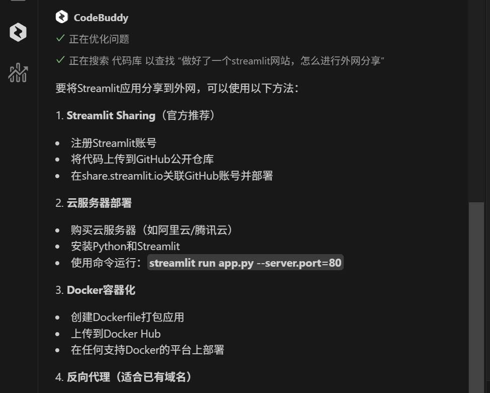 如何把 Streamlit 项目分享出去? CodeBuddy 会列出多种路径: