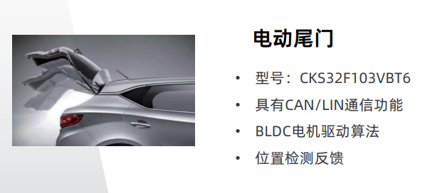 BLDC 电机驱动算法:CKS32F103VBT6 集成了 BLDC 电机驱动算法。汽车电动尾门通常采用无刷直流电机(BLDC)来实现尾门的开闭动作。该芯片的驱动算法能够精准控制电机的转速、转矩等参数,确保尾门在开启和关闭过程中运行平稳,避免出现卡顿、抖动等现象,同时还能有效提高电机的工作效率,降低能耗。