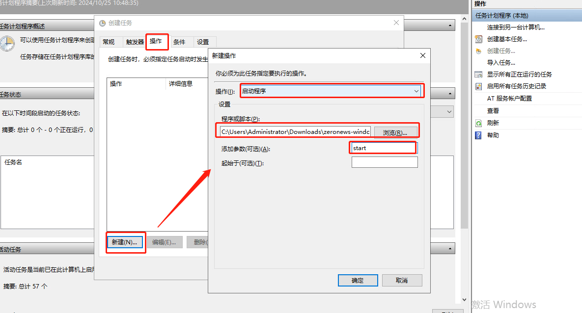在新建操作的窗口中,"操作" 选择 "启动程序", "程序与脚本" 点击 "浏览",选择 ZeroNews程序所在的文件目录,在 "添加参数"的输入框中,输入 "start", 然后点击确定完成创建