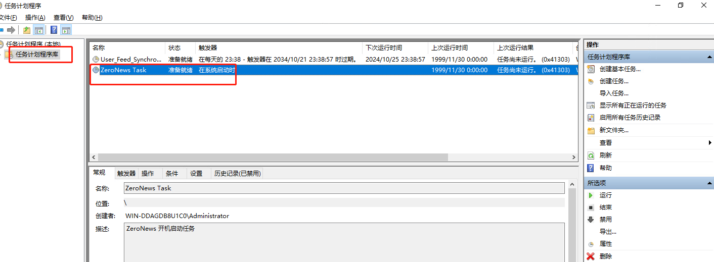 在任务计划程序库中,可以查看已经添加好的ZeroNews启动计划任务