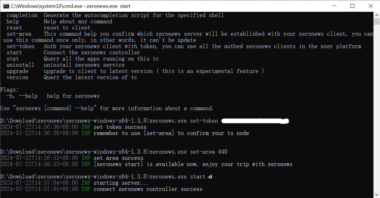 在ZeroNews命令行窗口中,通过以下命令完成 ZeroNews 的Token 认证