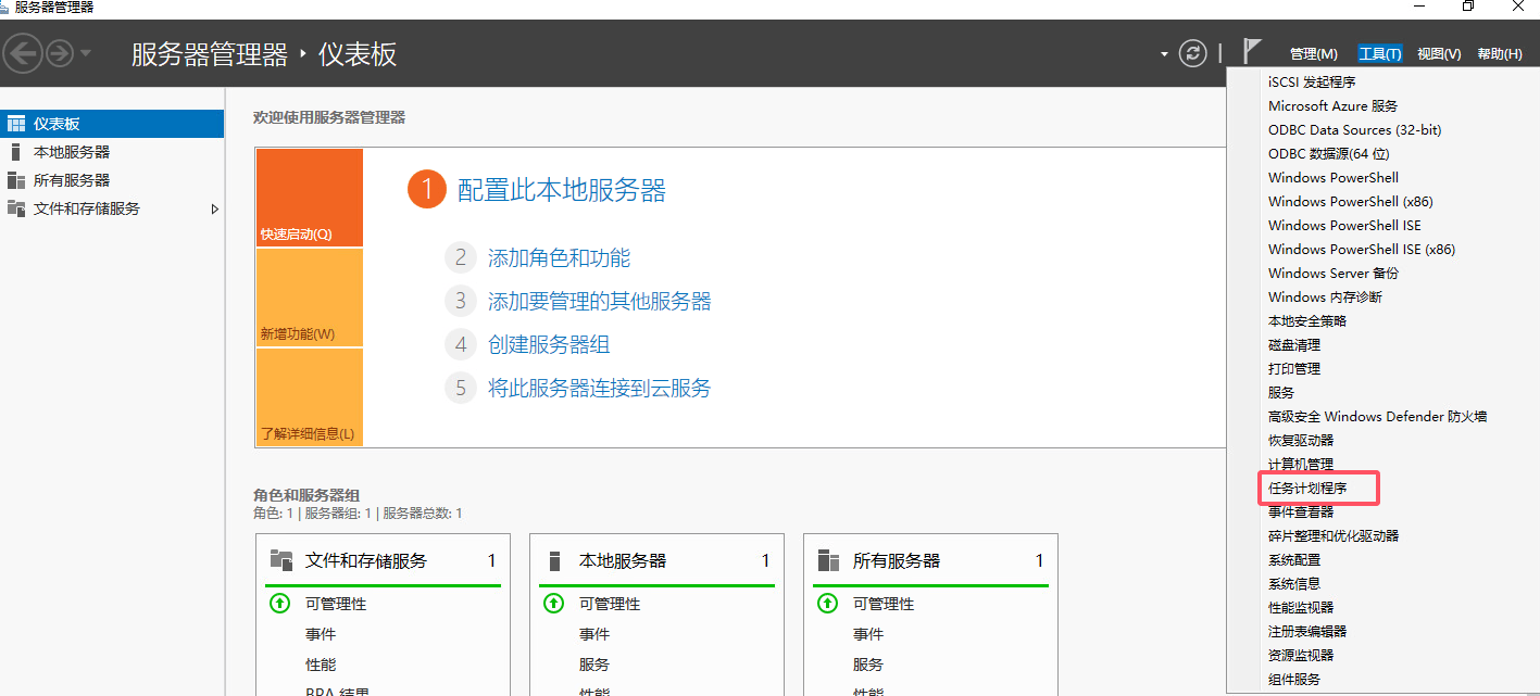 点击服务器管理器的面板右上方的"工具",找到 "任务计划程序",进入到任务计划配置页面