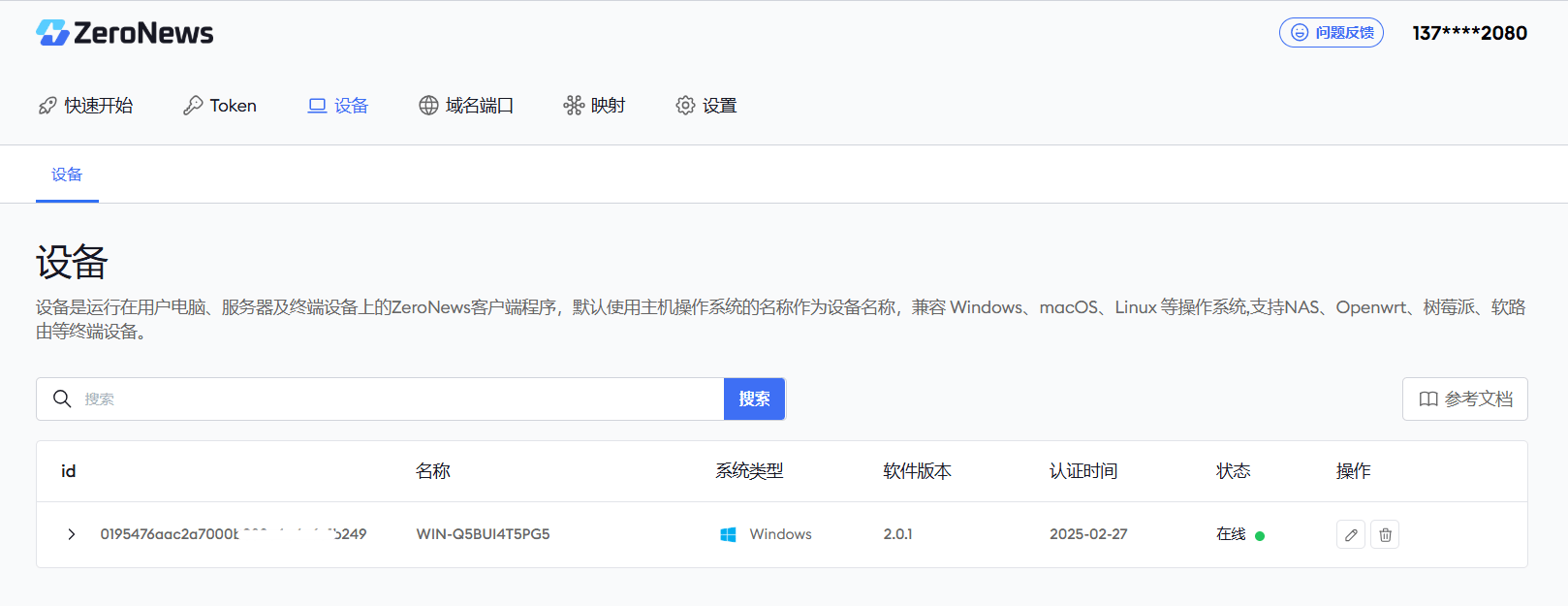 ZeroNews 启动后,您可以在 ZeroNews 平台上查看设备状态,确认其已成功上线。