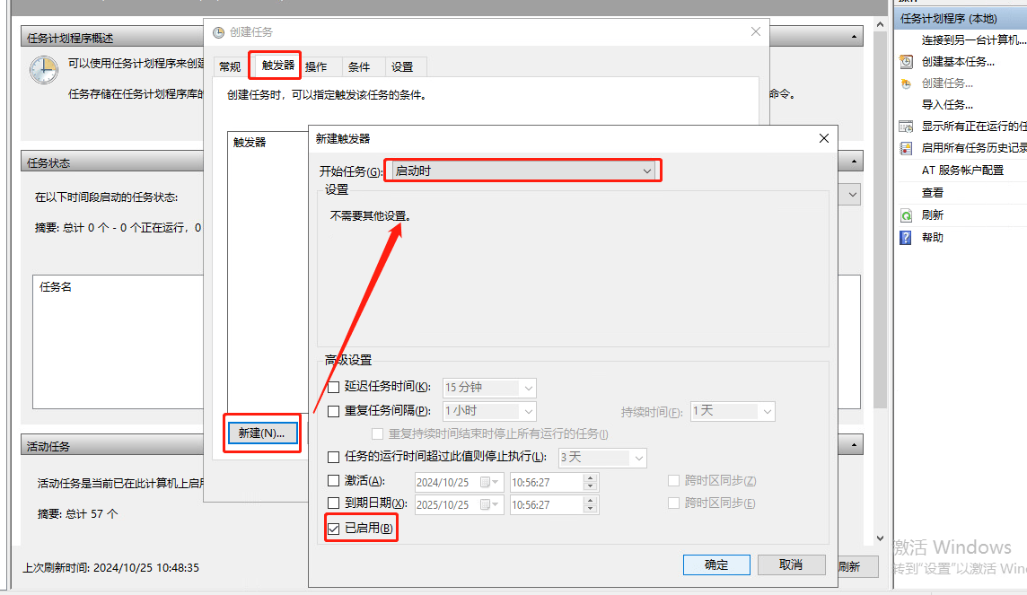在创建任务窗口的 "触发器" 界面中,点击"新建",新建一个启动的触发器
