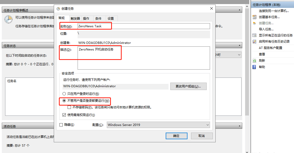 在windows server 系列系统中,ZeroNews 的开机自动默认需要用户登录操作系统之后,才能自动启动,利用系统的计划任务,可以实现用户不用登录的情况下,实现开机自动启动ZeroNews