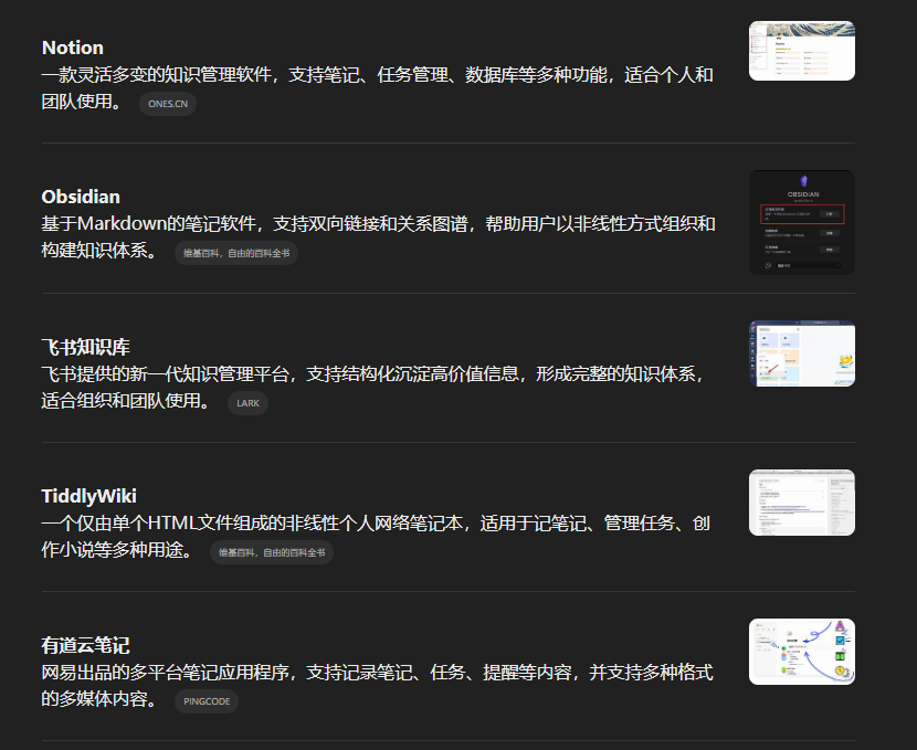 目前市面上可选的工具很多,例如 Notion、飞书、Obsidian、语雀、有道云笔记 等,它们在功能侧重点和使用场景上各有特点。
