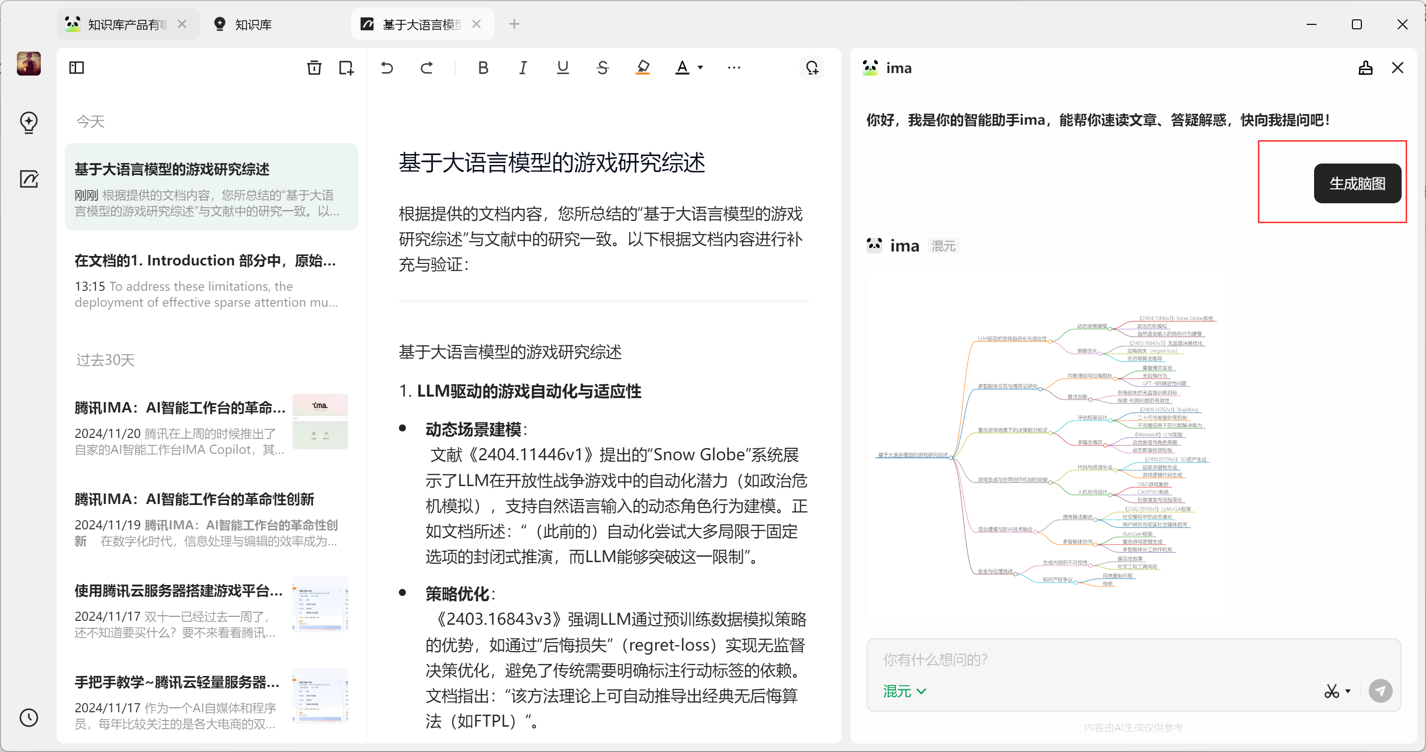 在 DeepSeek-R1 加持下,IMA 可以快速生成一篇完整综述,并自动绘制脑图,极大提升科研和写作效率。