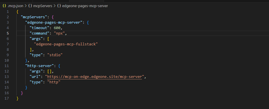 文件里的内容,可以直接从 EdgeOne 的 MCP 部署内容里复制过来,省时又省力,非常方便。