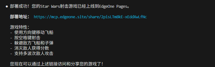 整个过程中,不仅实现了星球大战小游戏的构建,还尝试了高级功能如资源优化和 MCP 接入,工具智能性和可拓展性表现出色,特别适合快速原型和在线展示场景。
