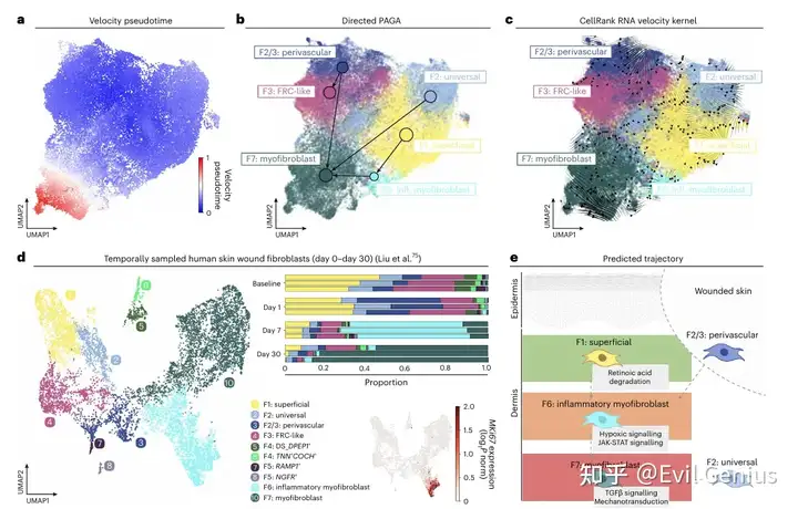 另一条轨迹源自F1:浅层成纤维细胞,通过F6:炎症性肌成纤维细胞这一中间状态向F7过渡