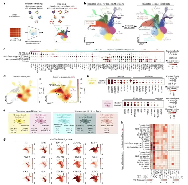 疾病特异性成纤维细胞(F6:炎症性肌成纤维细胞、F7:肌成纤维细胞和F8:筋膜样肌成纤维细胞)在健康皮肤中无对应亚型,且高表达肌成纤维细胞基因特征
