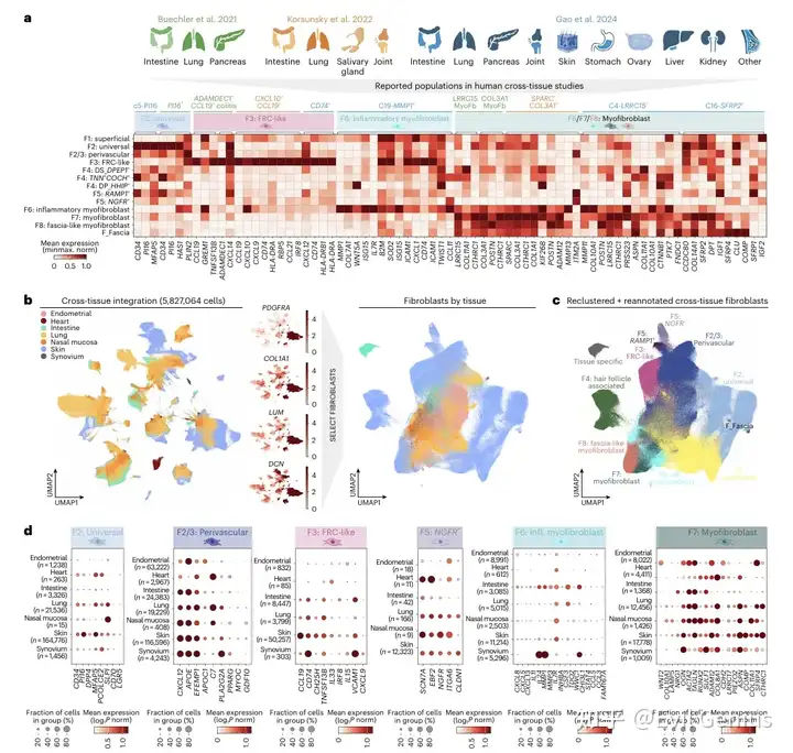 整合了来自皮肤、肺、肠道、滑膜、子宫内膜、心脏和鼻粘膜等组织的约580万个细胞的已发表数据集。基于典型标志基因表达,从中筛选出约100万个成纤维细胞进行下游分析。通过全转录组谱整合(而非有限标记基因),更全面地定义了细胞状态相似性:
