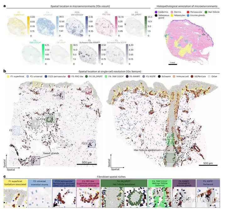 空间决定功能: 成纤维细胞亚型的位置与其功能高度相关,形成了支持上皮、免疫、脂肪生成、毛囊和神经系统的特化微环境。