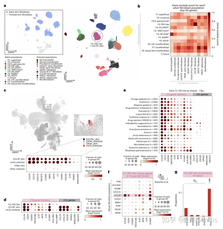 通过联合分析人类胚胎期皮肤与肠道数据,发现胚胎期皮肤CCL19+细胞与胚胎期肠道间充质LTo细胞聚集在同一亚群。这些皮肤CCL19+细胞表达已知的间充质LTo标志物78(包括CCL21、CXCL13、MADCAM1、FDCSP和TNFSF11(RANKL)),表明胚胎期皮肤CCL19+细胞可能以类似肠道LTo细胞的方式,发育分化为成人皮肤F3细胞。